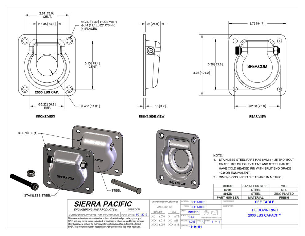 Recessed Tie Down, Stainless 2,000 lbs Capacity
